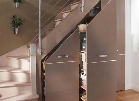 Je vais aussi me laisser un espace vide pour y mettre l’aspirateur, le sac de foot de mon fils et compagnie…Si les rangements existent en kit, ou modulable, il est possible de faire du sur-mesure. Et c’est ce qu’il me faudra faire car bien sûr, l’escalier n’est pas droit dans ses lignes. Il me faudra donc demander à mon beau-père (un peu) bricoleur, de me confectionner le cadre support des portes. Je n’aurais plus qu’à poser les portes de mon choix puis de choisir les rangements modulables qui me conviennent.